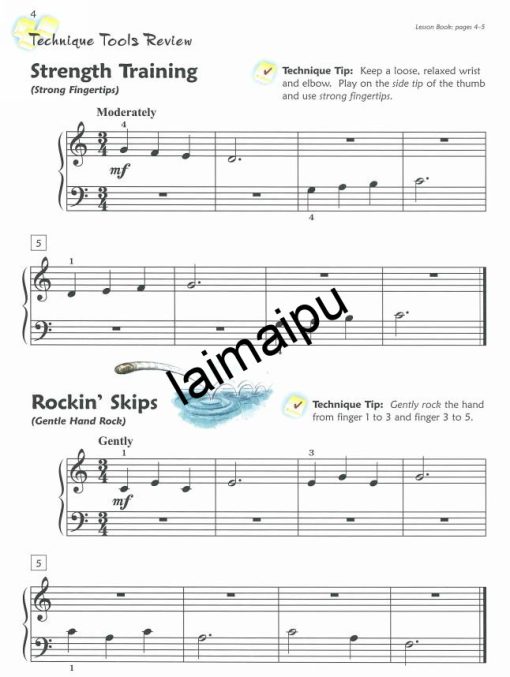 在技巧1A中学习的技术工具和艺术技巧在技术1B中得到了加强和扩展。四种新的技巧工具被介绍给大家,它们分别是流畅的连音,清晰的断奏,上升的手腕和惊人的乐句。模式化的练习提供了重复的练习,使技术感觉自然,艺术性的回旋曲展示了学生的技术在一个富有表现力的音乐环境中。新加入的 “手拉手工作坊 “着重于发展手拉手演奏的必要技巧。技巧书中的每一页都与课程书中的特定页面相对应。