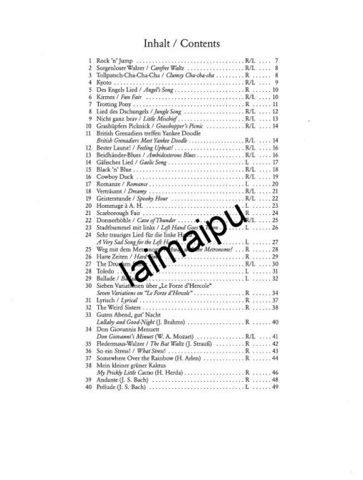 与其分手练习,来分别训练左右手,不如直接弹奏本来就是为单手所写的作品。本书中的40首有趣的曲子从非常简单到非常具有挑战性,同时包含从文艺复兴、古典、到近代电影以及民间音乐。很多乐曲都可以分别双手弹奏练习。对于想加强单独训练左手或右手的学生来说,本书无疑是一帖良药。