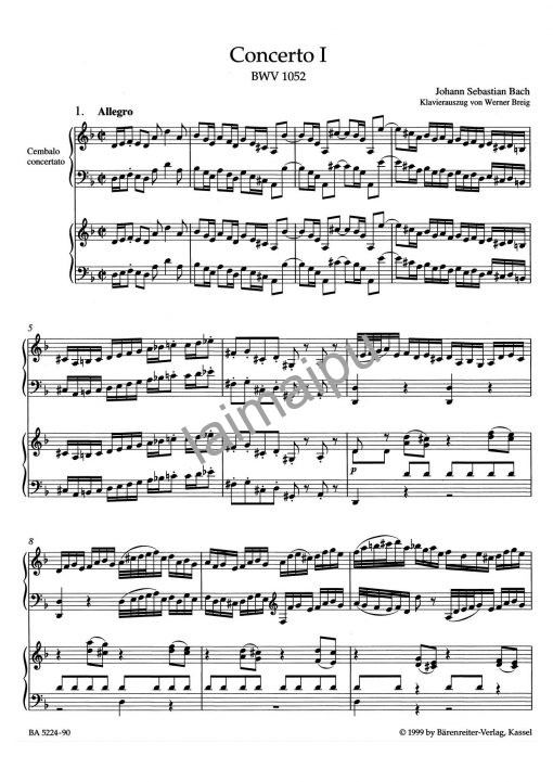 所有八首协奏曲[BA 5224-BA 5231]都是以钢琴缩编的形式呈现,并配有独立的乐队部分。钢琴缩编版不仅适合在大键琴上进行指挥,还可以在两台大键琴上演奏这些作品。巴赫的所有大键琴独奏协奏曲现在都可以通过新巴赫版的 “原典版 “获得。