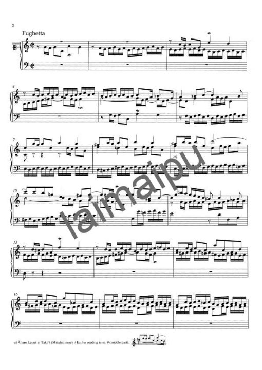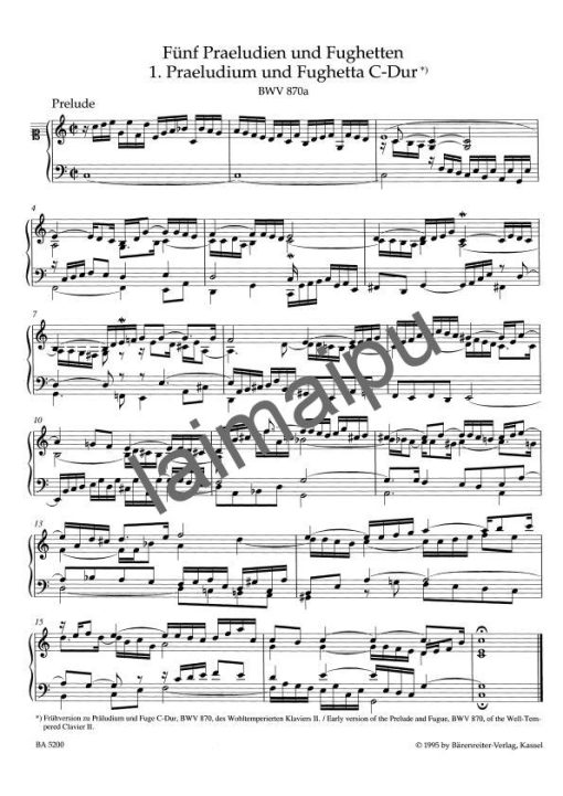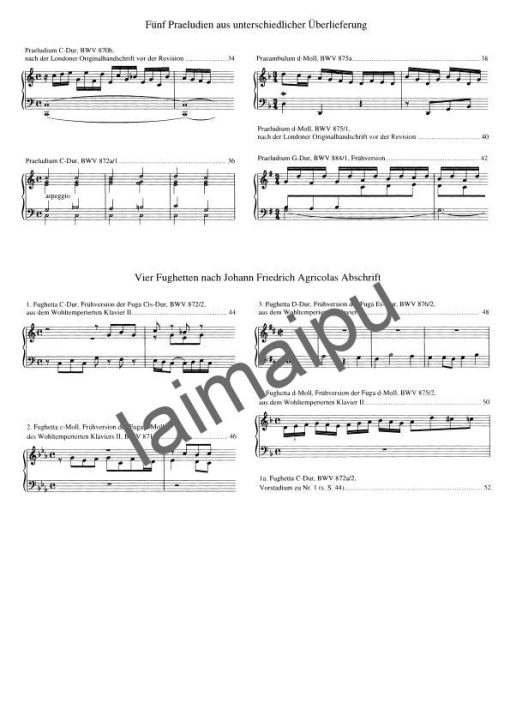 特别是,《平均律》第二卷的来源很复杂,因为巴赫的这部作品的 “明确版本 “从未被确定;这部作品存于两个不同的手稿传统中,都可以追溯到巴赫本人。直到现在,所有的印刷版本都将这两个传统合并为一个混合版本。Barenreiter Well-Tempered Clavier II将这两个传统分开,并将每首曲子以包含巴赫后续改动最多的版本呈现;另一个版本中的重要变体被添加为替代品,以便它们能够被演奏。