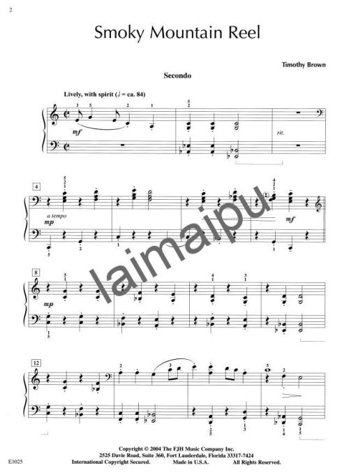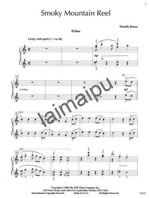 这首朗朗上口的蓝草风格四手联弹一定会让听众拍手叫好。巧妙地安排旋律在两位演奏者之间交替进行,这首曲子简短易学,但充满了丰富多彩的声音和质感。结尾的时候会有一个响亮的结尾!这就是FJH钢琴合奏系列。