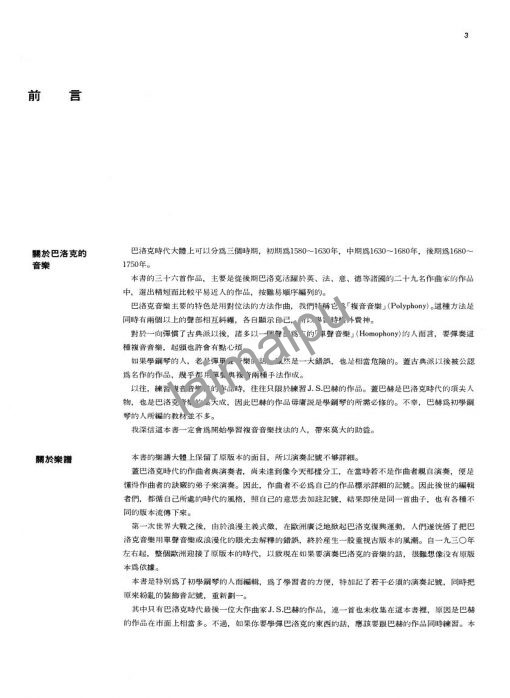 其中只有巴洛克时代最后一位大作曲家J. S. 巴赫的作品,连一首也未收集在这本书裡,原因是巴赫的作品在市面上相当多。不过,如果你要学弹巴洛克的东西的话,应该要跟巴赫的作品同时练习。本书的第1首至第20首,必须在学巴赫的二声部创意曲之前就要学习。第21首至第36首,跟“创意曲” 同时练留较佳。此外,爲了引起学习的与趣,也把一部份单声音乐性的作品收集在其中。