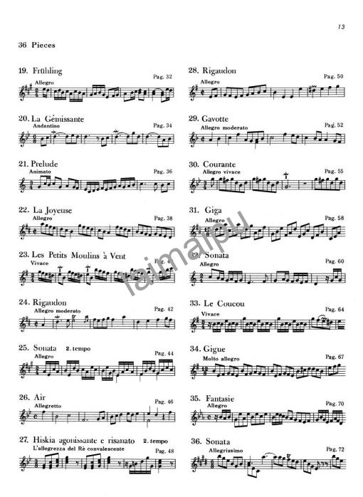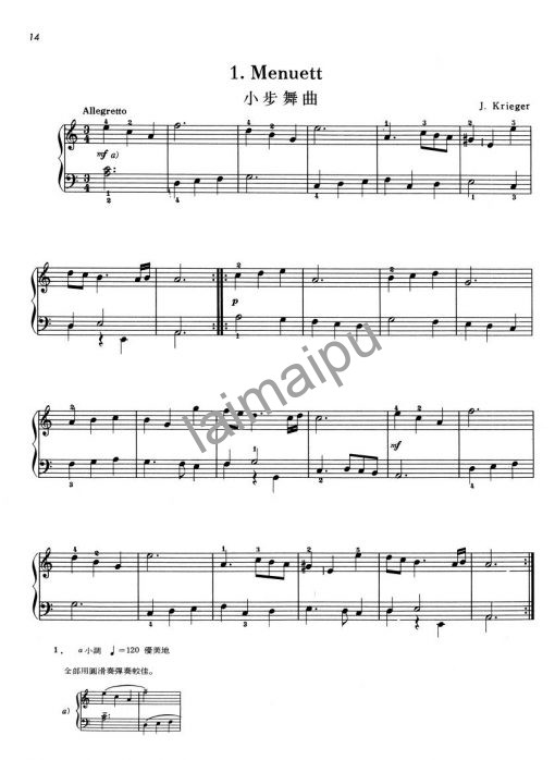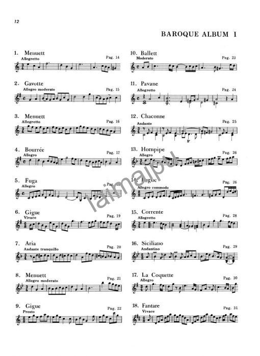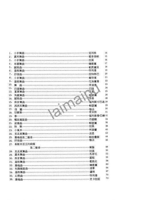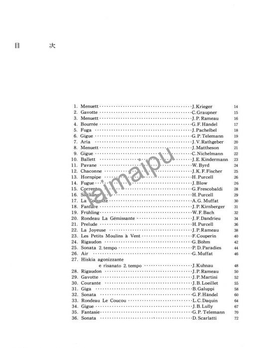 收录巴洛克时代后期活跃于英、法、德国的29名作曲家作品,选出精短又平易近人的36首,按难易顺序编列。大体上保留了原版本的面目,为使学习者方便,特加记了若干必须演奏记号,同时把原来纷乱的装饰音记号,重新划一。1~20首必须在巴赫的《二声部创意曲》之前就要学习,21首之后曲目与“创意曲”同时练习较佳。