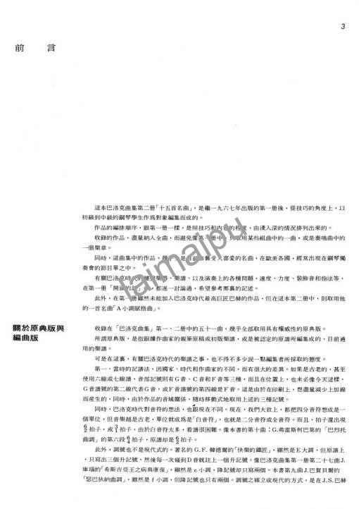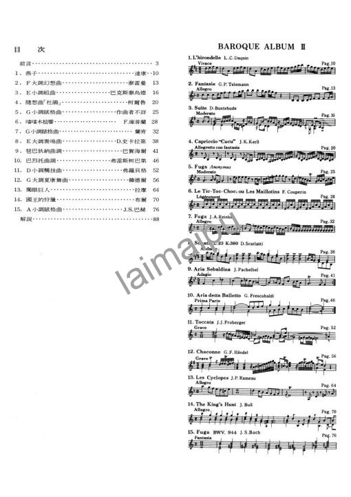 這本巴洛克曲集第二册「十五首名曲」,是繼一九六七年出版的第一册後,從技巧的角度上,以初級到中級的鋼琴學生作爲對象編集而成的。