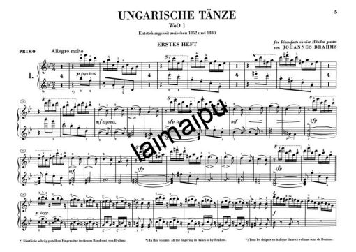 时至今日,勃拉姆斯的《匈牙利舞曲》仍是他最受欢迎的作品之一–尽管这些作品根本不是他写的!他在第一版的扉页上明确指出,他 “只为钢琴二重奏编曲”。正如他在第一版的扉页上明确指出的那样,他 “只为钢琴二重奏而编曲”。他的意思是说,他把匈牙利舞曲,融合成一个更大的实体,然后把结果出版,首先是为钢琴二重奏编曲,因为当时这种二重奏的表演极为流行。1869年印制了前两卷,收录了舞蹈1-10,1880年勃拉姆斯又增加了两卷,收录了舞蹈11-21。