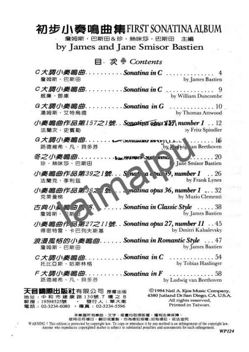 作曲家、作者、编者、译者 | Fritz Spindler | 斯宾德勒, Tobias Haslinger | 哈斯林格, William Duncombe | 敦孔布, Dmitri Kabalevsky | 卡巴列夫斯基, Frank Lynes | 林恩斯, Jane Smisor Bastien | 巴斯蒂安, Ludwig van Beethoven | 贝多芬, Muzio Clementi | 克莱门蒂, Thomas Attwood | 阿特伍德 |