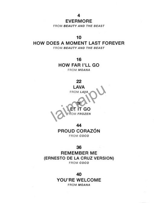这本四手联弹收集了更新的迪斯尼电影与动画主题曲。包含冰雪奇缘、美女与野兽、寻梦环游记、海洋奇缘、熔岩等八首歌曲。