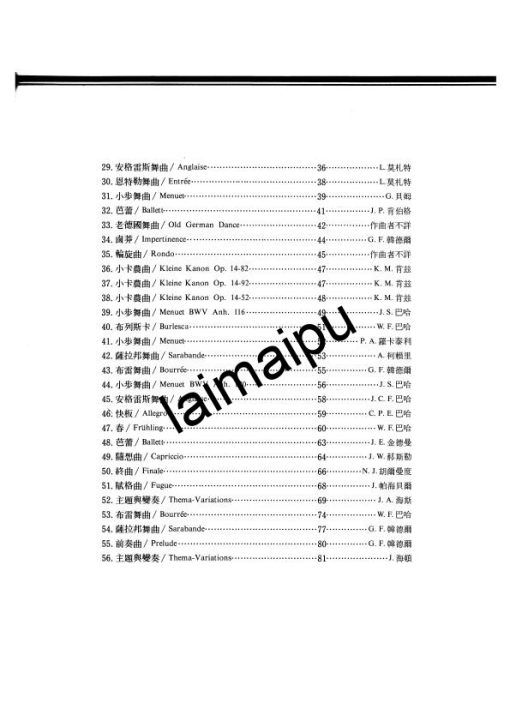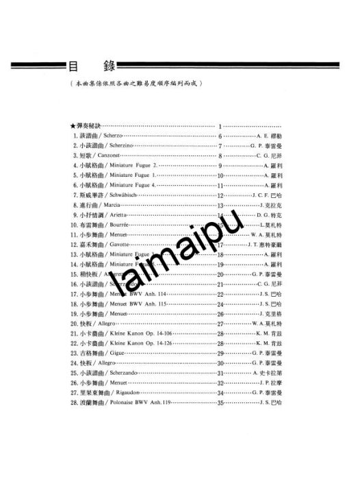 ★ 彈奏秘訣 1. 詼諧曲/Scherzo……A. E. 繆勒 2. 小詼諧曲/Scherzino……G. P. 泰雷曼 3. 短歌/Canzonet……尼菲 4. 小賦格曲/Miniature Fugue 2.……A. 羅利 5. 小賦格曲/Miniature Fugue 1.……A. 羅利 6. 小賦格曲/Miniature Fugue 4.……A. 羅利 7. 斯威畢許/Schwäbisch……J. C. F. 巴哈 8. 進行曲/Marcia……J. 克拉克 9. 小抒情調/Arietta……D. G. 特克 10. 布雷舞曲/Bourrée……L. 莫札特 11. 小步舞曲/Menuet……W. A. 莫札特 12. 嘉禾舞曲/Gavotte……J. T. 惠特豪爾 13. 小賦格曲/Miniature Fugue 3.……A. 羅利 14. 小賦格曲/Miniature Fugue 5.……A. 羅利 15. 稍快板/Allegretto……G. P. 泰雷曼 16. 小詼諧曲/Scherzando……C. G. 尼菲 17. 小步舞曲/Menuet BWV Anh. 114……J. S. 巴哈 18. 小步舞曲/Menuet BWV Anh. 115……J. S. 巴哈 19. 小步舞曲/Menuet……J. 克里格 20. 快板/Allegro……W. A. 莫札特 21. 小卡農曲/Kleine Kanon Op. 14-106……K. M. 肯茲 22. 小卡農曲/Kleine Kanon Op. 14-126……K. M. 肯茲 23. 吉格舞曲/Gigue……G. P. 泰雷曼 24. 快板/Allegro……G. P. 泰雷曼 25. 小詼諧曲/Scherzando……A. 史卡拉第 26. 小步舞曲/Menuet……J. P. 拉摩 27. 里果東舞曲/Rigaudon……G. P. 泰雷曼 28. 波蘭舞曲/Polonaise BWV Anh. 119……J. S. 巴哈 29. 安格雷斯舞曲/Anglaise……L. 莫札特 30. 恩特勒舞曲/Entrée……L. 莫札特 31. 小步舞曲/Menuet……G. 貝姆 32. 芭蕾/Ballett……J. P.肯伯格 33. 老德國舞曲/Old German Dance……作曲者不詳 34. 鹵莽/Impertinence……G. F.韓德爾 35. 輪旋曲/Rondo……作曲者不詳 36. 小卡農曲/Kleine Kanon Op. 14-82……K. M. 肯茲 37. 小卡農曲/Kleine Kanon Op. 14-92……K. M. 肯茲 38. 小卡農曲/Kleine Kanon Op. 14-52……K. M. 肯茲 39. 小步舞曲/Menuet BWV Anh. 116……J.S. 巴哈 40. 布列斯卡/Burlesca……W. F. 巴哈 41. 小步舞曲/Menuet……P. A. 羅卡泰利 42. 薩拉邦舞曲/Sarabande……A. 柯賴里 43. 布雷舞曲/Bourrée……G. F. 韓德爾 44. 小步舞曲/Menuet BWV Anh. 120……J. S. 巴哈 45. 安格雷斯舞曲/Anglaise……J. C. F. 巴哈 46. 快板/Allegro……C. P. E. 巴哈 47. 春/Frühling……W. F. 巴哈 48. 芭蕾/Ballett……J. E. 金德曼 49. 隨想曲/Capriccio……J. W. 郝斯勒 50. 終曲/Finale……N. J. 胡爾曼度 51. 賦格曲/Fugue……J. 帕海貝爾 52. 主題與變奏/Thema-Variations……J. A. 海斯 53. 布雷舞曲/Bourrée……W. F. 巴哈 54. 薩拉邦舞曲/Sarabande……G. F. 韓德爾 55. 前奏曲/Prelude……G. F. 韓德爾 56. 主題與變奏/Thema-Variations……J. 海頓