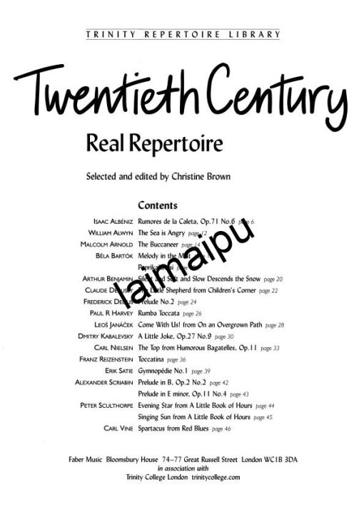 作曲家、作者、编者、译者 | Arnold, Malcolm | 阿诺德, Delius, Frederick | 大流士, Harvey, Paul | 哈维, Nielsen, Carl | 尼尔森, Reizenstein, Franz | 莱森斯坦, Sculthorpe, Peter | 斯克尔索普, Alwyn, William | 阿尔文, Bela Bartok | 巴托克, Benjamin, Arthur | 本杰明, Debussy, Claude | 德彪西, Dmitri Kabalevsky | 卡巴列夫斯基, Eric Satie | 萨替, Isaac Albeniz | 阿尔贝尼兹, Janáček, Leoš | 杨纳切克, Scriabin (Skrjabin), Alexander | 斯克里亚宾, Vine, Carl | 凡恩 |