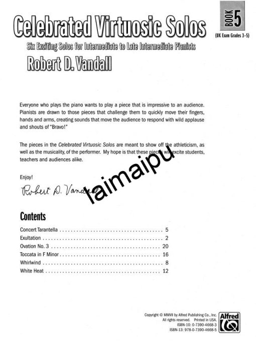 所有弹钢琴的学生都希望弹出让观众印象深刻的音乐。他们会被那些挑战他们快速移动手指、手臂和手的作品所吸引,创造出能让观众大喊 “Bravo!”的声音。范达尔的《著名超技钢琴独奏曲集》中的独奏曲是为了展现演奏者的运动能力和音乐性。这套五卷本系列中的音乐会让任何一个学生发挥出 “演奏家 “的风采,一定会让学生、老师和观众都感到兴奋!