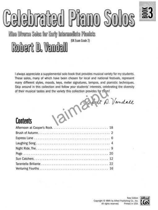 本书最初由Myklas音乐出版社出版,现已重新刻印,并有一个吸引人的新封面。延续了 “著名钢琴独奏曲集 “系列汇编,其中收录了范达尔久经考验、屡获殊荣的独奏曲。非常适合作为教师的参考资料,也是快速学习音乐的学生的音乐来源。各种风格和调式。