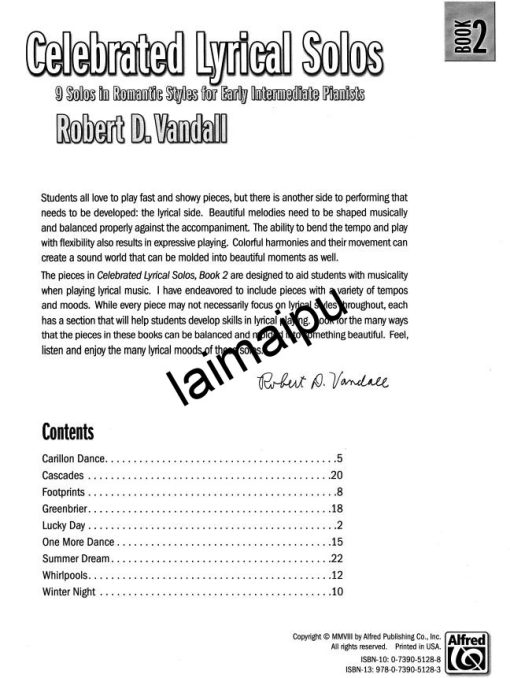 范达尔所著的《著名抒情独奏曲》第2册是为了帮助学生在演奏抒情音乐时提高音乐性而设计的。这套丛书收录了范达尔最喜欢的独奏曲以及新创作的乐曲,每一首乐曲都非常适合培养这种音乐风格的演奏技巧。每本书中的乐曲都有优美的旋律、多彩的和声、不同的节奏和情绪,都为塑造和塑造表现力的时刻提供了机会。
