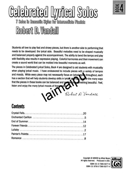 范达尔所著的《著名抒情独奏曲》第4册是为了帮助学生在演奏抒情音乐时提高音乐性而设计的。这套丛书收录了范达尔最喜欢的独奏曲以及新创作的乐曲,每一首乐曲都非常适合培养这种音乐风格的演奏技巧。每本书中的乐曲都有优美的旋律、多彩的和声、不同的节奏和情绪,都为塑造和塑造表现力的时刻提供了机会。