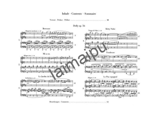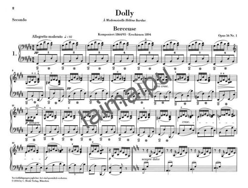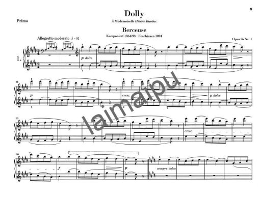 这个小套曲中的六首作品写于1893年至1896年间。这些作品的灵感来自与他交好的一位歌手的女儿埃莱娜-巴尔达克。这个女孩出生于1892年,因其身材娇小玲珑,被称为 “多莉”。这些作品主要是为她的生日或新年而作,反映了成长中的孩子所经历的世界,从摇篮曲到喜怒无常的舞蹈。但这并不意味着要太认真,从他自己的音乐和别人的音乐的微妙典故中就可以看出。尽管这些作品的基本结构简单,但很快就广为流传,其中包含了许多法国作曲家典型的和声和节奏的微妙之处–“儿童音乐 “也很适合成人欣赏。