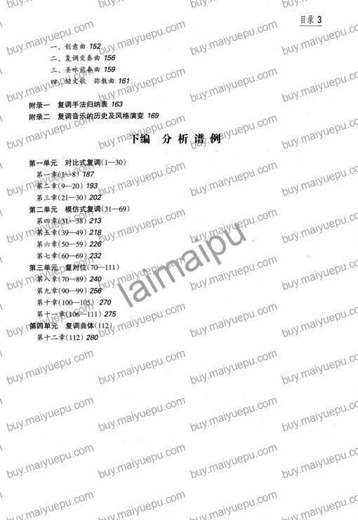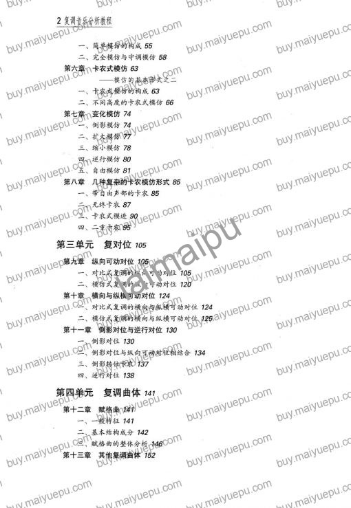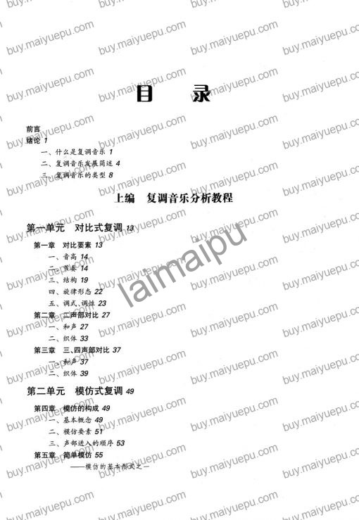《复调音乐分析教程》内容简介:作为多声部音乐之一的复调音乐是构筑音乐大厦的重要材料,它以藤蔓式的横向线条与基石般的纵向和声紧密配合,共同营造着作品的立体化音响效果。和声与复调就像一枚钱币的两面,互为表里,谁也离不开谁。音乐院校作曲专业开设的作曲技术理论“四大件”中,和声与复调总是其中不可缺少的两门课程。但是,音乐院校中非作曲专业的复调公共课却常常被忽视,探其究竟,教学模式的困惑或相关教材的匮乏当是其中重要的原因。不开设复调公共课会造成学生知识结构的欠缺,这一点许多同仁们是有所共识的,但如何开设该门课程就不仅是个人认知问题,而更是个实践层面上的问题。目前大多数音乐院校、师范院校和声与复调公共课的教学思路,基本上是根据作曲专业以写作为主的模式进行因陋就简的改造而来。这种作法不能不说是解决课程开设难题的办法之一,而且是最省事的,但它却存在着许多的弊端。本来,非作曲专业学生由于学习任务和专业条件的不同就没有必要进行太多、太重的写作训练,何况恰恰是这种费时费力的写作训练影响了学生对更宽阔、更系统、更相关的知识、文献和信息的获取。