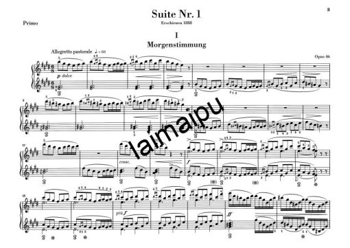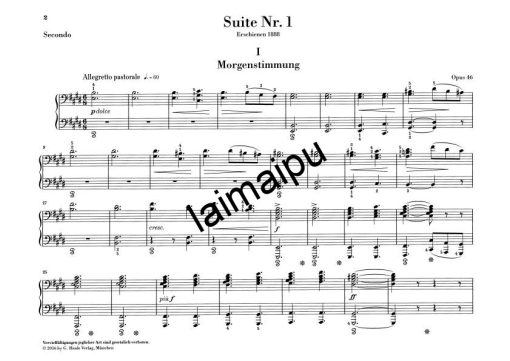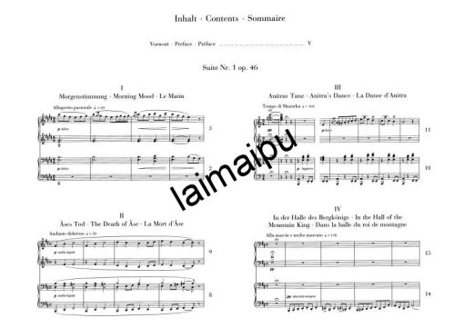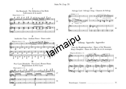 格里格为易卜生的戏剧 “Peer Gynt “创作的配乐中包含了他最著名的作品,如《晨曦的心情》和《在山王的大厅里》。格里格后来将这些最优美的作品提取出来,形成了两首管弦乐套曲,并亲自将这些版本编排成钢琴独奏和钢琴四手联弹。在准备他们的Urtext版时,亨乐公司有一个惊喜。在亲笔签名和第一次印刷的版本中,第二套曲中还包含了另一个乐章 “山王女儿的舞蹈”(格里格在不久后将其删除)。这支迷人的舞蹈出现在这一版的附录中–这是120年来首次再次印刷! 挪威钢琴家、格里格专家艾纳-斯泰恩-诺克勒贝格是这一版的共同编辑,还提供了新的指法。