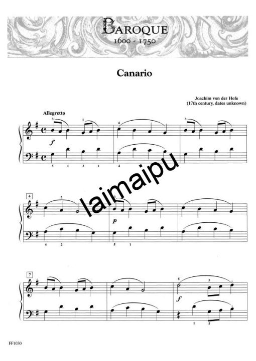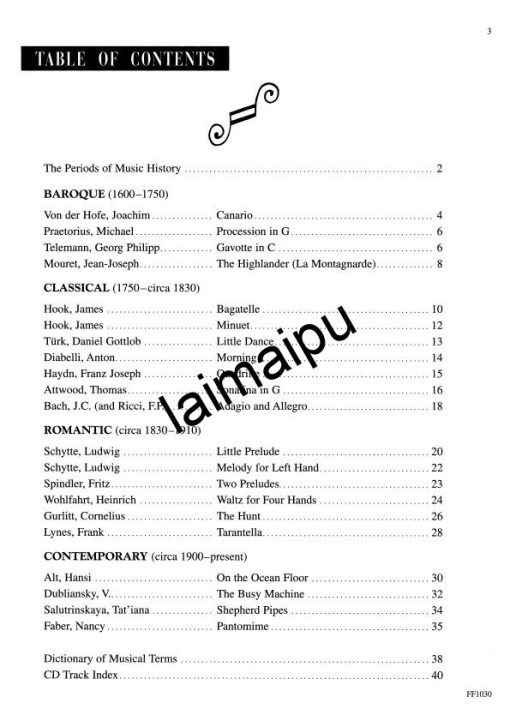 作曲家、作者、编者、译者 | Dubliansky, V. | 杜布连斯基, Fritz Spindler | 斯宾德勒, Hofe, Joachim Von der | 范登霍夫, Ludwig Schytte| 席特, Mouret, Jean-Joseph | 穆雷, Praetorius, Michael | 普雷托里亚斯, Salutrinskaya, Tat'iana | 萨卢特林斯卡娅, Wohlfahrt, Heinrich | 沃尔法特, Cornelius Gurlitt | 科尼利厄斯.固利特, Daniel Turk | 蒂尔克, Diabelli, Anton | Anton.迪亚贝利, Faber, Nancy | 南希.菲伯尔, Frank Lynes | 林恩斯, Georg Philipp Telemann | 泰雷曼, Hook, James | 胡克, Johann Christian Bach | JC 巴赫, Joseph Haydn | 海顿, Thomas Attwood | 阿特伍德 |