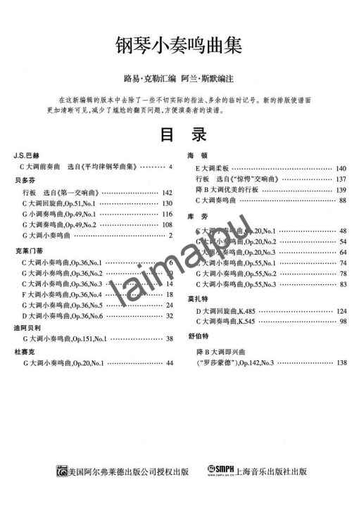 《钢琴小奏鸣曲集》是由著名作曲家、教育家路易‧克勒汇编而成的,这本曲集受到一代又一代的钢琴教师和学生的喜爱。在阿尔弗莱德版的《钢琴小奏鸣曲集》中,阿兰‧斯默对整个曲集的内容进行了修订,去除了一些不切实际的指法、多余的临时记号,并减少了尴尬的翻页问题。新的排版扩大了五线谱之间的距离,使原本拥挤的谱面更为清晰可见,方便演奏者读谱。此外,该版本还增加了深受大众喜爱的贝多芬《G 大调小奏鸣曲》和迪阿贝利《小奏鸣曲集》。
