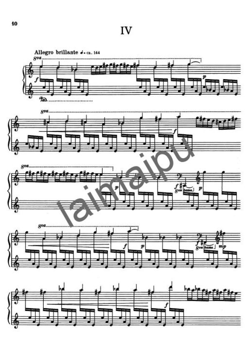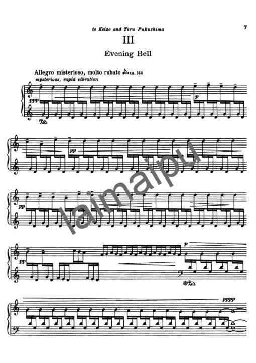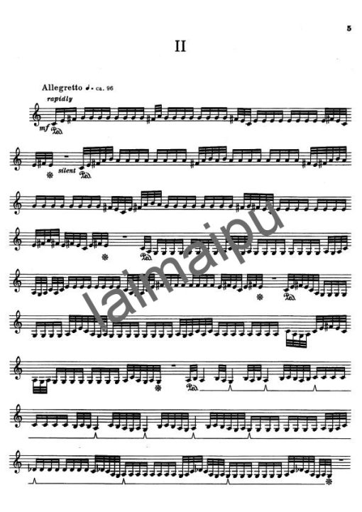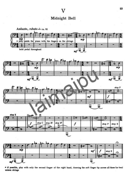 这套组曲前四首没有拍号,自由的以大量的重复音模仿传统乐器。第五首则以手指拨弦,创造出完全不同的声音。十分有特色。