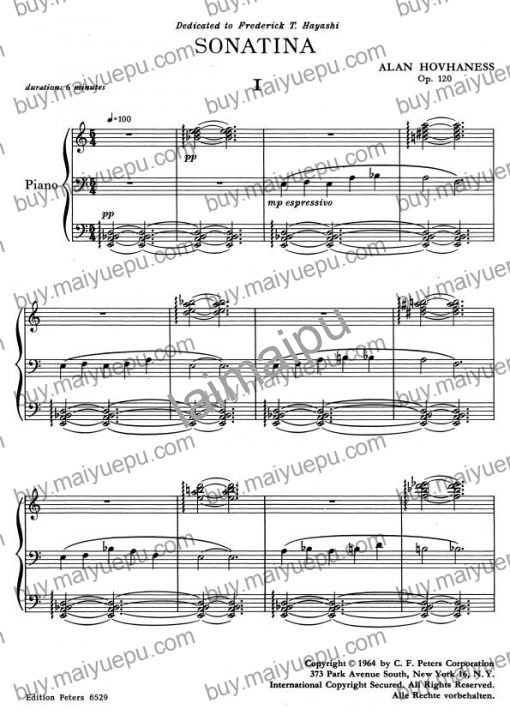 亚美尼亚-苏格兰裔美国作曲家霍夫哈尼斯(1911-2000)身居现代作曲家中产量前几位,光交响曲变有67首。他早期深受西贝柳斯影响,后曾受马尔蒂努指导,对于东方音乐有终其一生的热爱,也被人认为是早期有极简主义特色的作曲家之一。他的这首小奏鸣曲以7个音符写成,三个乐章。