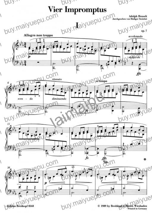 亨塞尔特是胡梅尔的学生,与李斯特同时期的超技钢琴家与作曲家,虽然活了70余岁却在而立之年退出音乐会与作曲的舞台,至今原因不明。他的弹奏技巧融合胡梅尔的流畅与李斯特的声响,作品则有许多练习曲。这四首即兴曲也是各需要不同的技巧才能胜任。