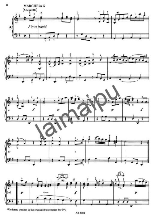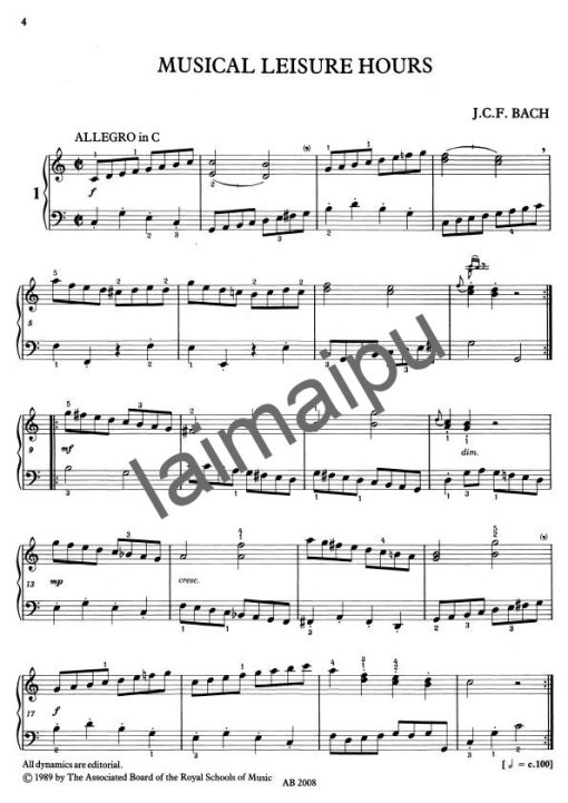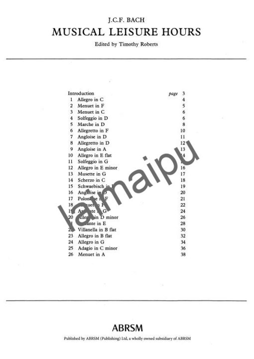 巴赫的第九子J. C. F. 巴赫,在1787-8年间出版了四大卷以 Musical Leisure Hours 为名的键盘与其他作品。ABRSM 挑选其中 26 首当时较为时兴的舞曲形式或有他父亲风格的作品。