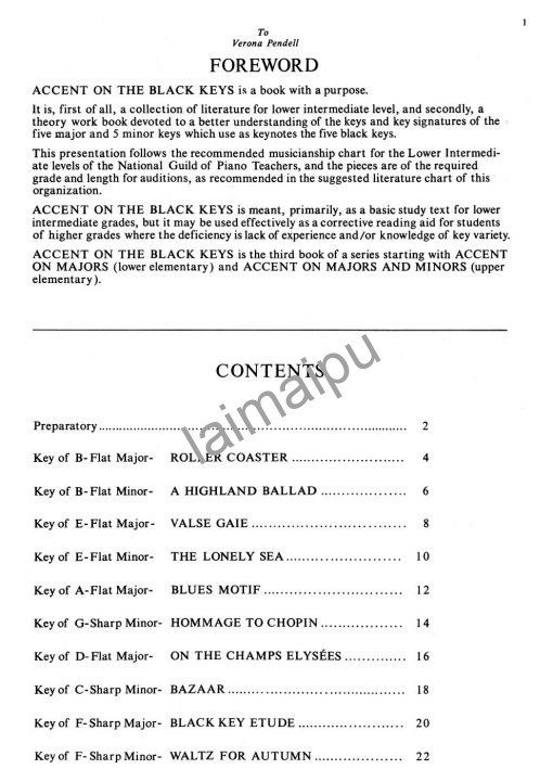 聚焦黑键大小调是一本精彩的集子,收录了10首吉洛克的原创作品,如《Valse Gaie》、《On the Champs Elysees》和《Hommage to Chopin》。它还可以作为一本理论工作手册,确保更好地理解以黑键开始的五个大调和五个小调。乐曲前有音阶、调式中的和弦和终止式,还要求学生写出每首乐曲的调号。