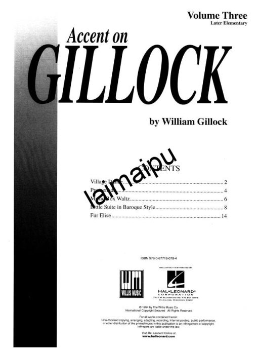 Accent on Gillock系列收录了William Gillock最受欢迎的所有钢琴独奏曲。第3卷收录了他初级后期的乐曲,都是以吉洛克非凡的风格创作的。