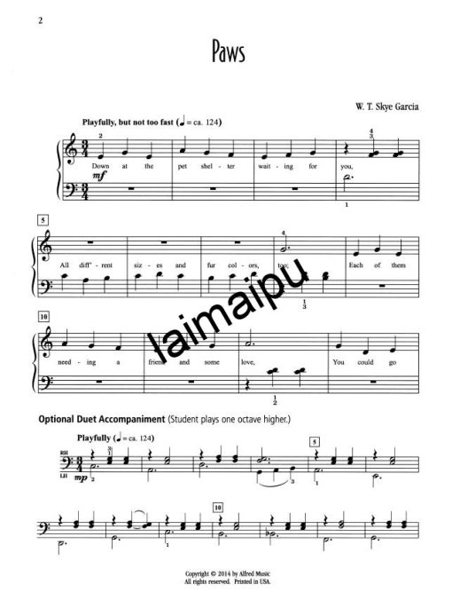 This solo by W. T. Skye Garcia has playful lyrics and a melody that is in an easy singing range for elementary students. It describes musically all the fun that is found in visiting an animal shelter and picking out a new pet. The melody is divided between the hands and harmonic seconds and thirds imitate the meows and woofs of cats and dogs. The optional teacher duet accompaniment provides harmonic interest and a steady rhythmic background.