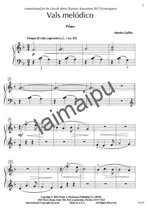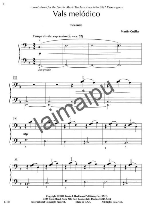 3级、钢琴四手联弹、这首由内布拉斯加林肯MTA委约创作的F大调华尔兹表现力强,旋律优美,合奏简单,适合初级后期演奏。悠扬的和声需要踏板贯穿始终。