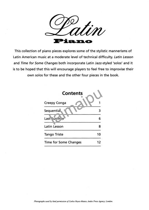 4-5级、钢琴、独奏、六首拉丁风味的组曲、中等程度技巧可演奏。