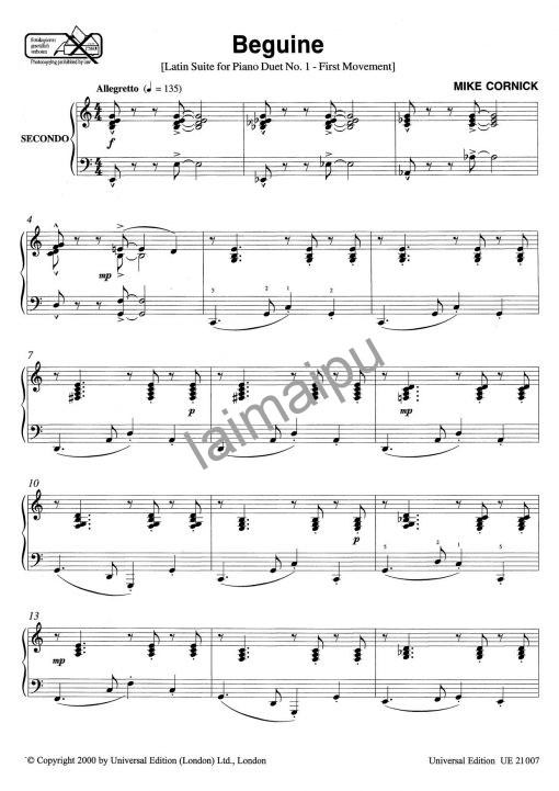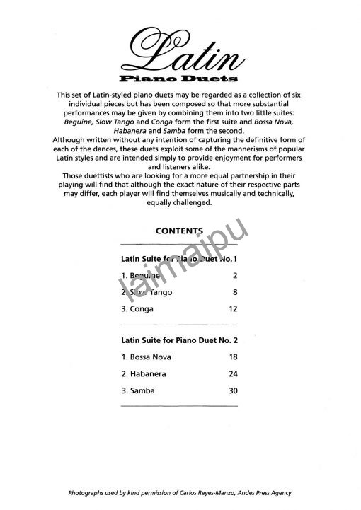 4-5级、钢琴、四手联弹、两套拉丁风味的组曲、包含贝圭英、探戈、波萨诺瓦、森巴、哈巴涅拉、康加舞六种风格。