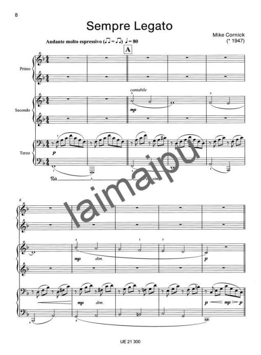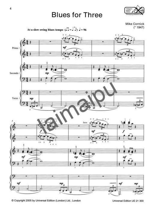 这是一套不同寻常的原创作品集,适合三位钢琴家演奏,简单到中级水平的作品。这些作品风格各异,从充满情调的《三人蓝调》到Encore–一首有趣的音乐小品,这些作品可以表明钢琴家并不总是需要单独工作。这四首曲子既可以单独演奏,也可以作为套曲演奏。
