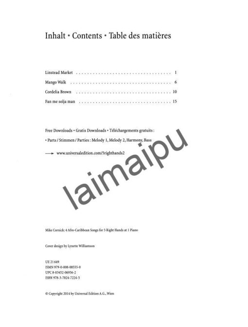 科尼克: 依非洲/加勒比风格,为 5 只右手所写的 4 首小品 (Cornick: 4 Afro-Caribbean Songs for 5 Right Hands at 1 Piano)