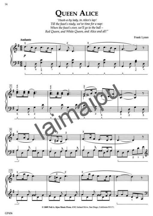爱丽丝成为女王,红白皇后坐在她身边。两个皇后在红皇后唱了摇篮曲后睡着了。爱丽丝来到一座拱门前,上面写着“爱丽丝女王”,两个门铃拉手各写着“宾客专用”和“仆人专用”。爱丽丝怎么样也没办法找到人来开门,这时来了只青蛙,踢了门一下,于是门开了。里面有好几百个声音合唱,欢迎爱丽丝女王。里面是个大厅,坐着各样人物,红白皇后已经就座,爱丽丝坐在她们之间的空位子。当她要发言致谢时,厅内变成一种奇幻式的混乱场景。爱丽丝忍无可忍,于是使劲扯掉桌布,锅碗瓢盆、客人、蜡烛全掉下来,摔在地上。当她气冲冲的右看向红皇后时,红皇后已经变成一个娃娃大了。爱丽丝抓起她,反复的说:“我要把你摇成小猫!”
