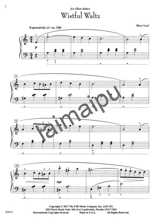 这首肖邦式的华尔兹舞曲具有精致的抒情性,是浪漫主义风格的最佳入门曲目。简单的左手和弦模式的使用,使年纪小或手小的学生也能理解这首作品。