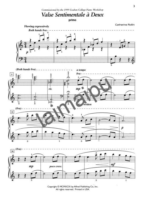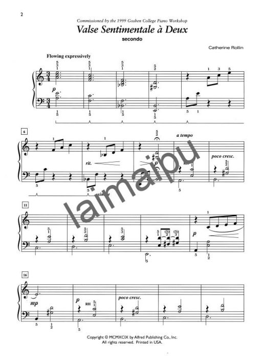 这是一首迷人的、令人难忘的、具有浪漫风格的原创华尔兹,对于两位中级钢琴家来说,这将是一首可爱的演奏曲。这首曲子以A小调为基调,质地和节奏变化丰富,但并不过分复杂,而且乐谱以大而易读的记谱法排列。罗林女士很好地运用了琶音和半音,两位演奏者都有机会演奏旋律线,并为演奏贡献其他重要的对比音乐元素。