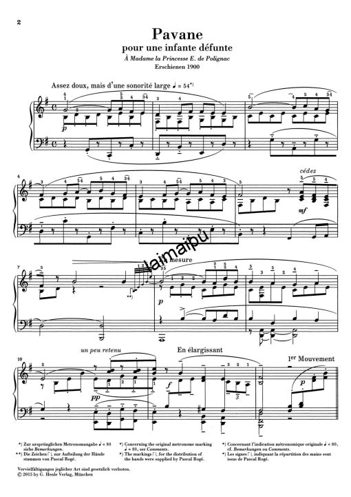 据拉威尔自己说,1899年创作的这首钢琴小曲《悼念公主的帕凡舞曲》这个奇怪的标题不应该被赋予太多重要性。他之所以选择这个标题,主要是因为他喜欢它所包含的重音。但同时他也同意,这首乐曲让人联想到 “一个小公主曾经可能在西班牙宫廷里跳过的帕凡舞曲”。1902年首演后,这首简单而有效的作品获得了无与伦比的知名度,尤其是反映在对它的大量编曲上,其中有一首为小管弦乐队而作的编曲是由拉威尔本人亲自完成的。Henle以原版形式出版了该作品。