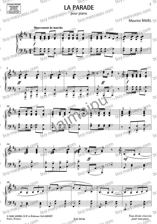 拉威尔鲜为人知的作品,生前未出版的”游行”,这首曲子既不是芭蕾,也不是舞曲的组曲,而是由连贯的舞蹈乐章与场景串联重复而成的”舞蹈娱乐”。由进行曲乐章开始,到场景一、圆舞曲乐章、马祖卡速度、圆舞曲速度、”去除”等主题显现,也一直听到进行曲的出现,就像手稿中提及这是”写给歌剧的脚本”,可以将其当做纯音乐的舞蹈表演。