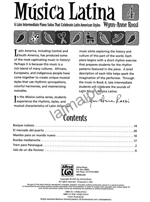 在Musica Latina系列中,学生将体验拉丁美洲音乐的节奏、风格和音乐特点。每首作品都以简短的节奏练习开始,让学生为作品中的节奏模式做准备。每首乐曲的简要说明有助于激发演奏者的想象力。第第4册是为中级后期的钢琴学生编写的。