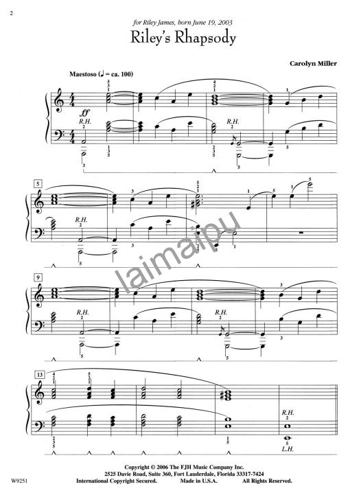 这首富有创造性的中级乐曲,探讨了技术和教学上的挑战。这首曲子包含了对比强烈的旋律和节奏部分,以雄伟的 “大调 “开场,两只手互相映衬着演奏八度音。单音的旋律,三和弦,以及大量的十六分音符模式,都在这首曲子中展现,提供了广泛的音乐技巧。