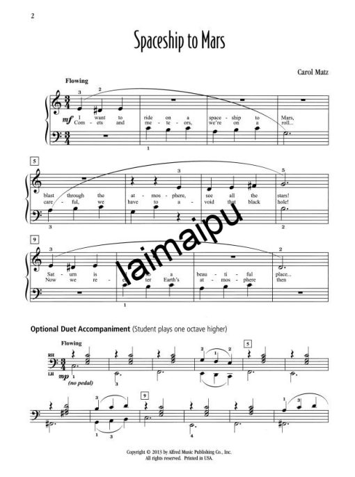 《火星飞船》是一首风格奇幻的华尔兹舞曲,这种奇幻风格常能唤起学生的学习热情。以中C位置写成,交替上升和下降的线条旋律以各种半音阶和全音阶为特色,为这一外太空体验创造了奇特的背景音乐。注意乐句和指法可以使旋律在3/4拍子中无缝地飘动。快结束时,学生们会注意到一个很特别全音音阶,作品也由于这个全音音阶,塑造了更加梦幻的特色。在这一瞬间,踏板的使用将可以更好的捕捉那种异国情调。可选择加入第二钢琴,以获得更丰富的层次与声响效果。享受你的宇宙之旅吧! 本曲是 2016-2020 联邦音乐节 (Federation Festivals) 精选作品。