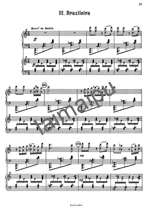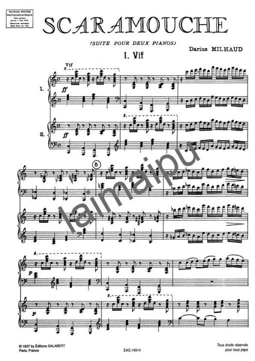 米尧的双钢琴曲丑角是他最有名的一首曲子。第一乐章喧腾欢闹、第二乐章是静谧的蓝调、第三乐章则是巴西的森巴。非常适合用于演奏会炒热气氛的乐曲。