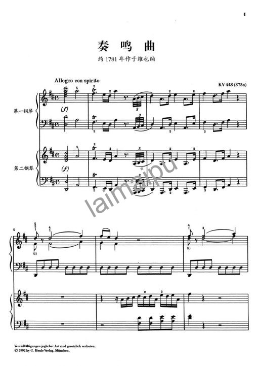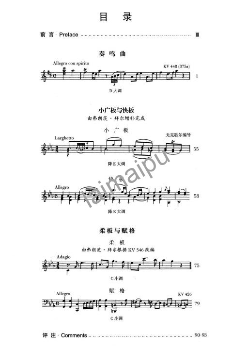 《莫扎特双钢琴作品集(原始版)》收录的是由弗朗兹·拜尔(Franz Beyer)所改编的双钢琴版。这首赋格的两次出版,无不在书名页中明确提及莫扎特在宫廷所任之新职。作曲家精心选择运用自己擅长的对位技术,以彰显对其任职的当之无愧,这肯定是有意而为。在《莫扎特双钢琴作品集(原始版)》结尾处的“评注”部分中,读者们可以阅读到关于作品底本的详尽资料信息,也可见到对作品当中若干问题的说明。从德国亨乐出版社原版引进,三首双钢琴作品及权威评注共同构成了《莫扎特双钢琴作品集(原始版)》经典之作。