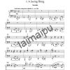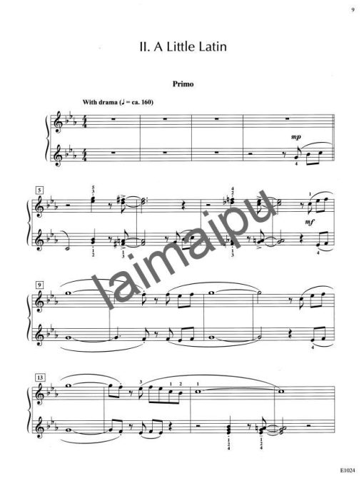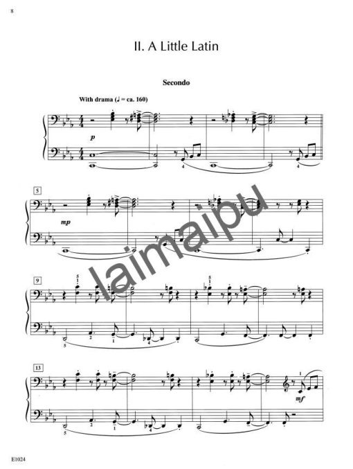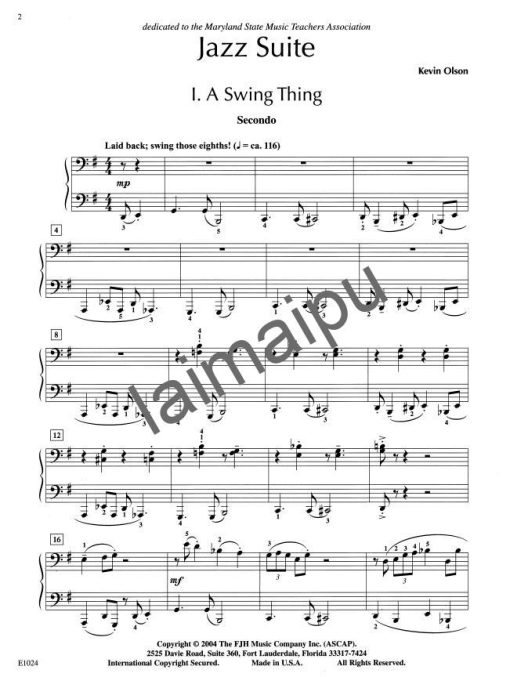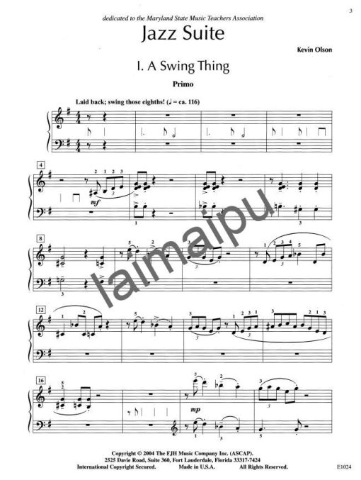 这首四手联弹的爵士组曲以四个乐章的形式演奏,探索对比鲜明的风格和调式,声音新鲜新潮。A Swing Thing 是一个欢快的节奏,摇摆的八分音符,加上行走低音、三连音以及切分音,提供道地的爵士风味。A Little Latin 是一种更悠闲的风格,有切分音、重音和桑巴节奏。Ballad for Julia 放慢了浪漫的情绪,和声中使用了9、11、13和弦。Blue Waltz 则以切分音和半音的方式,以活泼的风格为这套曲子画上圆满的句号。