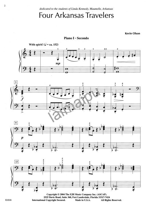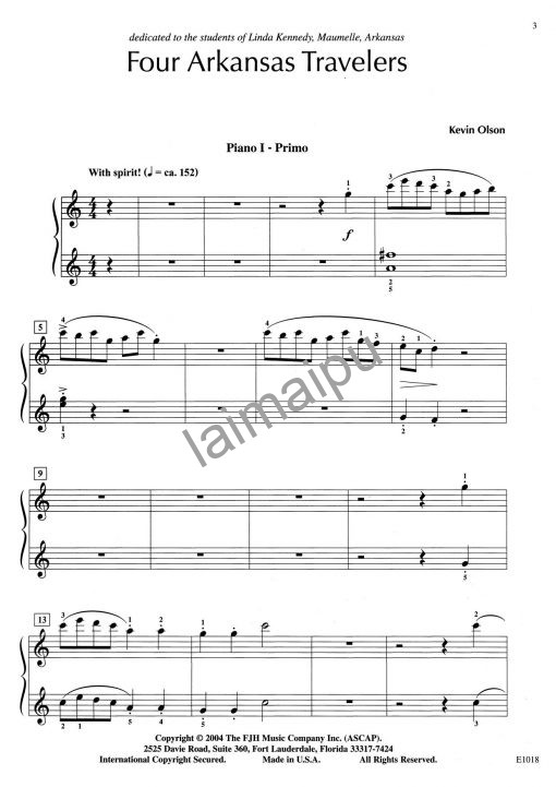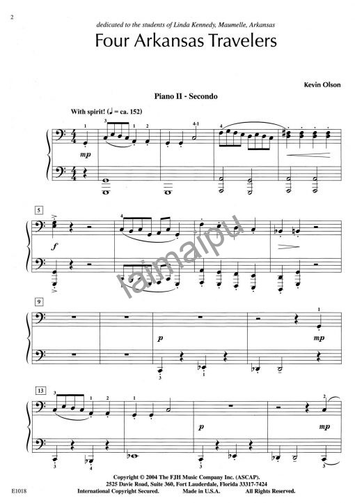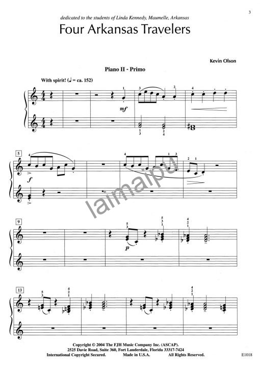 这首由2架钢琴/8只手组成的合奏曲充满了乐趣和活力。整首曲子中,旋律在每一个部分之间来回传递,而这些部分的难度都是一致的。乐曲探索了广泛的动态,包含了多种多样的衔接方式。四个部分之间的模仿,常常给人增添幽默感。