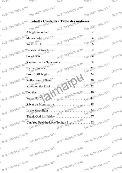 《狮子王》中埃尔顿-约翰的《今晚你能感受到爱吗》和电影《阿米莉》中扬-蒂尔森的《阿米莉圆舞曲》都是由Nicolai Podgornov改编的新钢琴独奏曲集。在他的第一张专辑获得成功后,他又为中级钢琴家创作了各种音乐惊喜。尼古拉-波德戈诺夫写道:我希望每一个浪漫的人–无论什么年龄–都能在这张专辑中发现感兴趣的东西,并在演奏这些作品时找到乐趣。