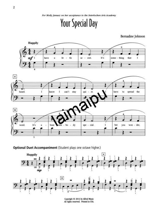 This happy solo by Bernadine Johnson celebrates a great achievement through music and lyrics. Written in Middle C position, the melody is divided between the hands and is in an easy singing range for students. Harmonic seconds and thirds are used as well. Slurs indicate legato playing, and an optional teacher duet accompaniment adds to the fun.