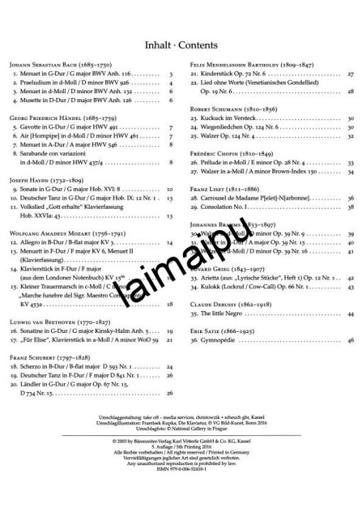 3级、4级、5级、6级、一般乐谱 (包含多首作品)、外文乐谱、钢琴 (一台琴)、1人、独奏、古典音乐 (近现代乐派)、古典音樂 (后浪漫時期)、古典音乐 (巴洛克)、古典音乐 (古典时期)、古典音乐 (浪漫时期)、古典音乐 (印象乐派)、Barenreiter Verlag