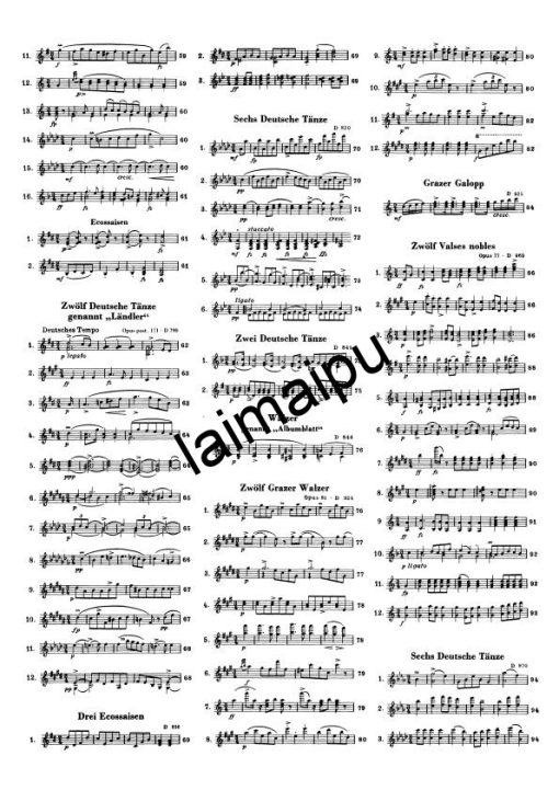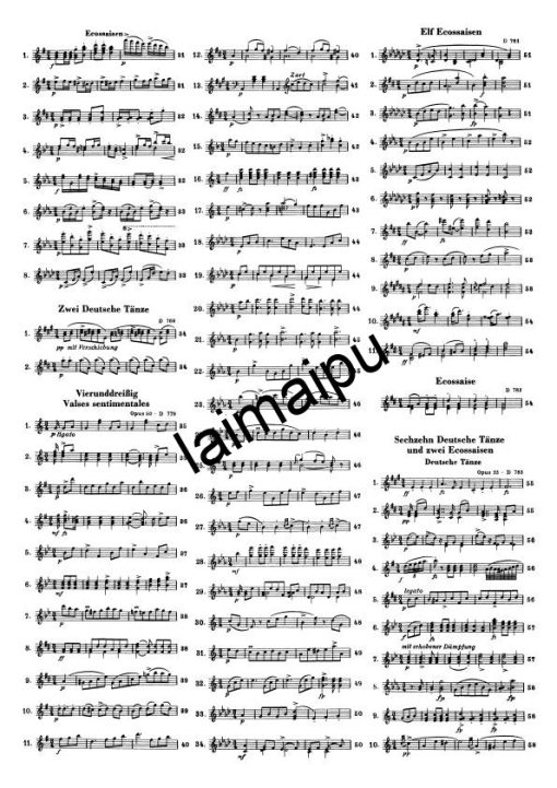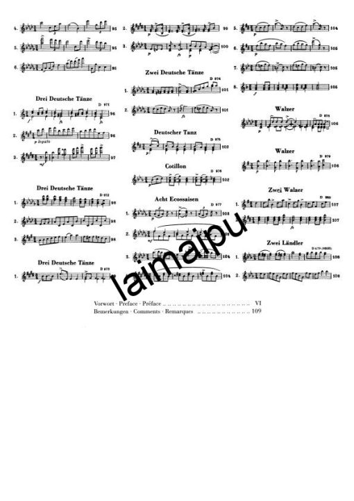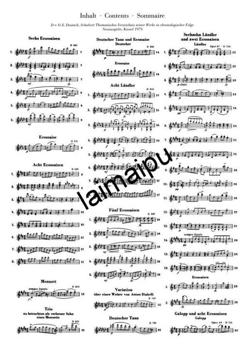 舒伯特在钢琴旁,用不完的丰富的舞蹈旋律,身边的朋友们边跳舞边说笑–这是我们非常珍惜的舒伯特的传统形象之一。舒伯特为这种聚会所发明的术语(Schubertiade)现在已经牢固确立。本卷包含200多首舞蹈、小步舞曲、华尔兹(包括著名的34首Valses sentimentales op. 50和12 Valses nobles op.77)ländler,écossaises,德国舞曲–每个都比下一个更可爱。这些作品创作于1816-1826年。在附录中,我们可以找到另外32首舞蹈,其中只有旋律被传送,或者最初很可能是为其他乐谱而创作的。